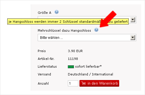 Das Hilfe-Icon wird per CSS neben dem Variantentitel platziert und kann beliebig über die neu eingefügten CSS-Klassen verändert werden, gleiches gilt für das Design der eigentlichen Hilfemeldung per mouseover.
