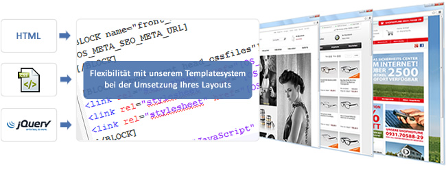 Das interaktiv.shop-Templatesystem basiert auf einem eigens entwickelten System. Sämtliche Layout-Bereiche können über CSS und HTML individuell angepasst werden. Die Implementierung von eigenen Templates und selbst entworfenen Designs ist einfach. Der Aufbau des HTML-Gerüsts wurde so konzipiert, dass ein komplettes Shop-Design mit sehr wenig Aufwand realiseirt werden kann.