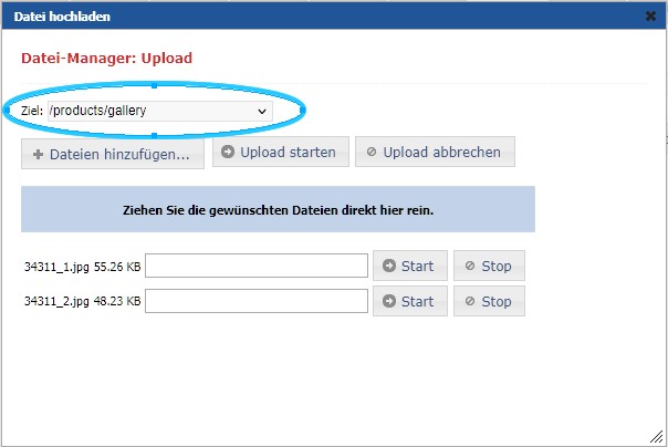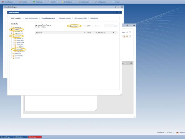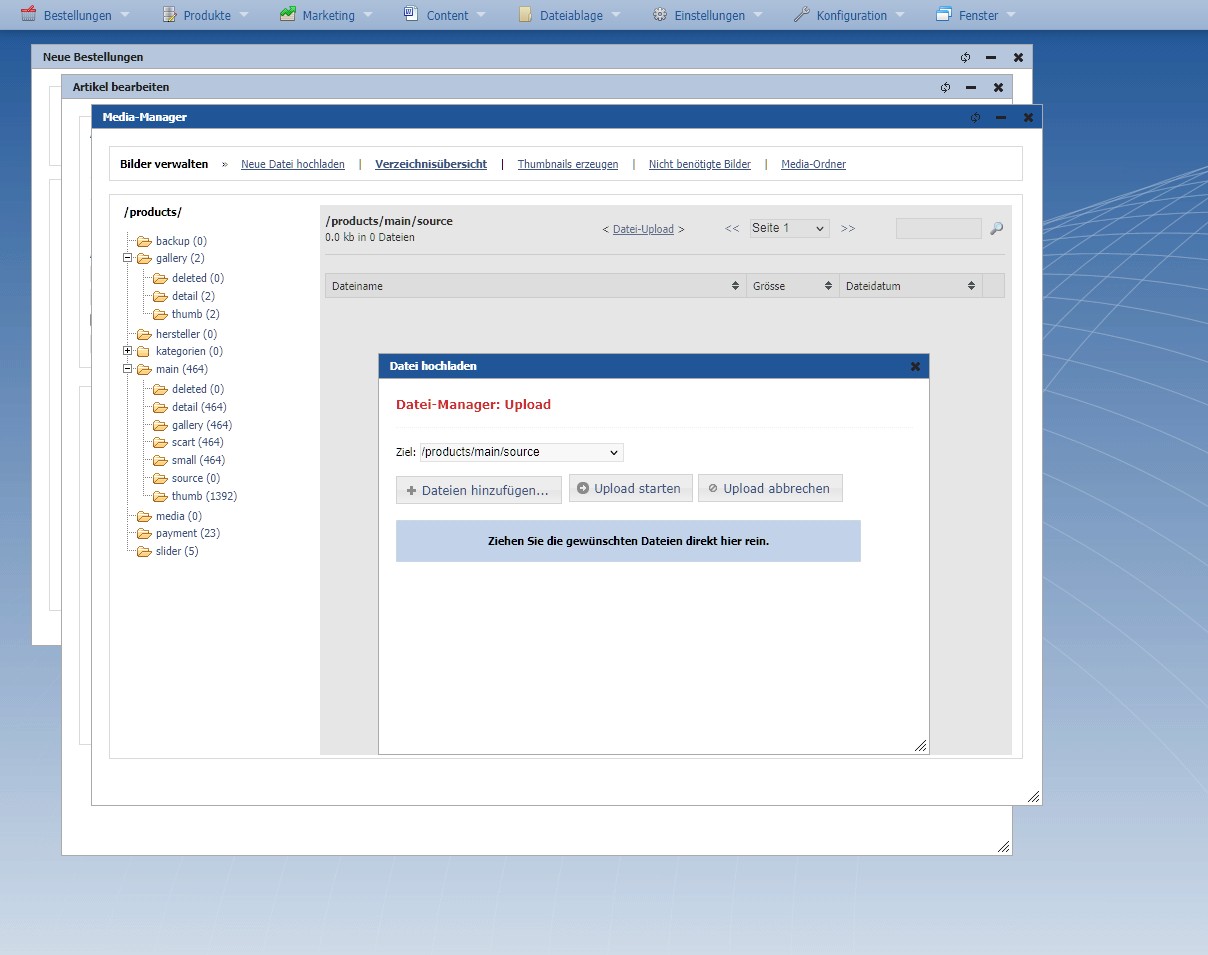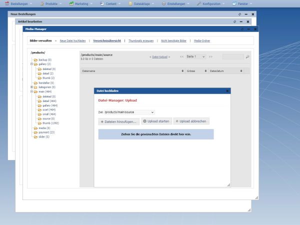 Der Upload der Bilder kann im Shop-Manager an zwei Stellen erfolgen:
