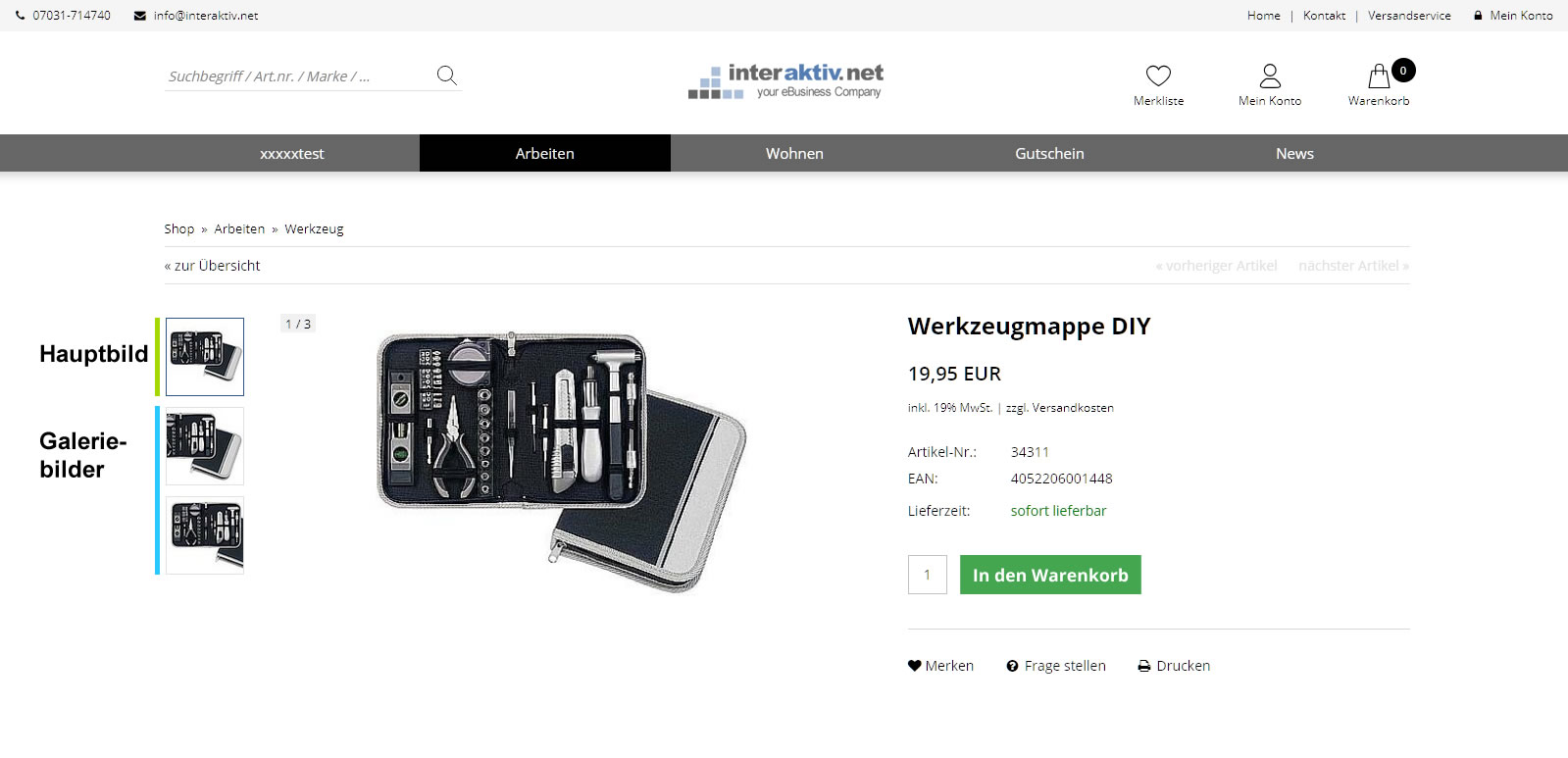 Der Shop unterscheidet zwischen Hauptbild und Galeriebildern, die in verschiedenen Verzeichnissen auf dem Server abgelegt werden. Das Hauptbild wird in der Artikelansicht als erstes angezeigt und sowohl in der Listenansicht als auch im Warenkorb verwendet.