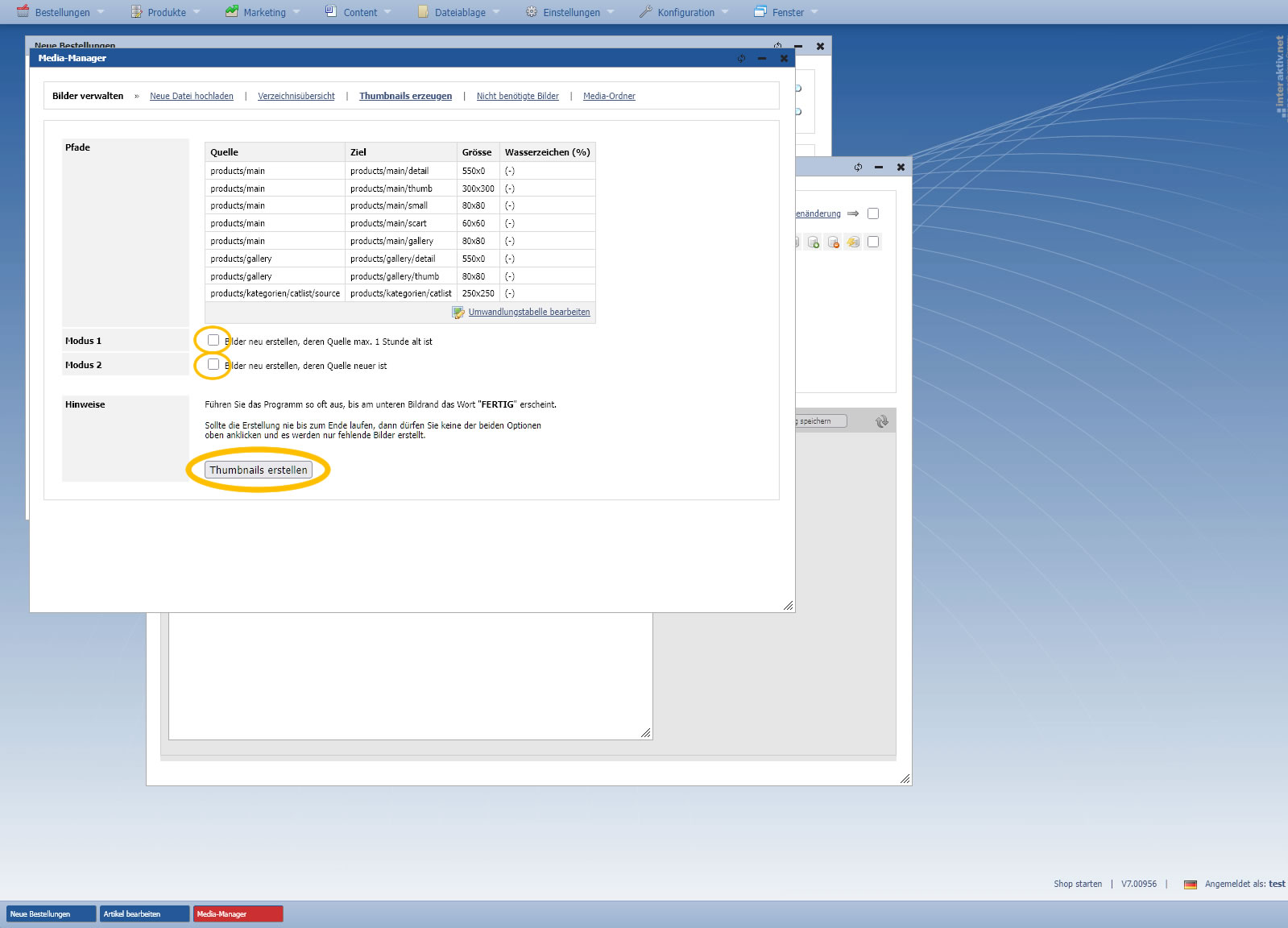 Um die notwendigen Bildgrößen für den Shop zu erzeugen, bietet der Shop-Manager die Funktion "Thumbnails generieren".